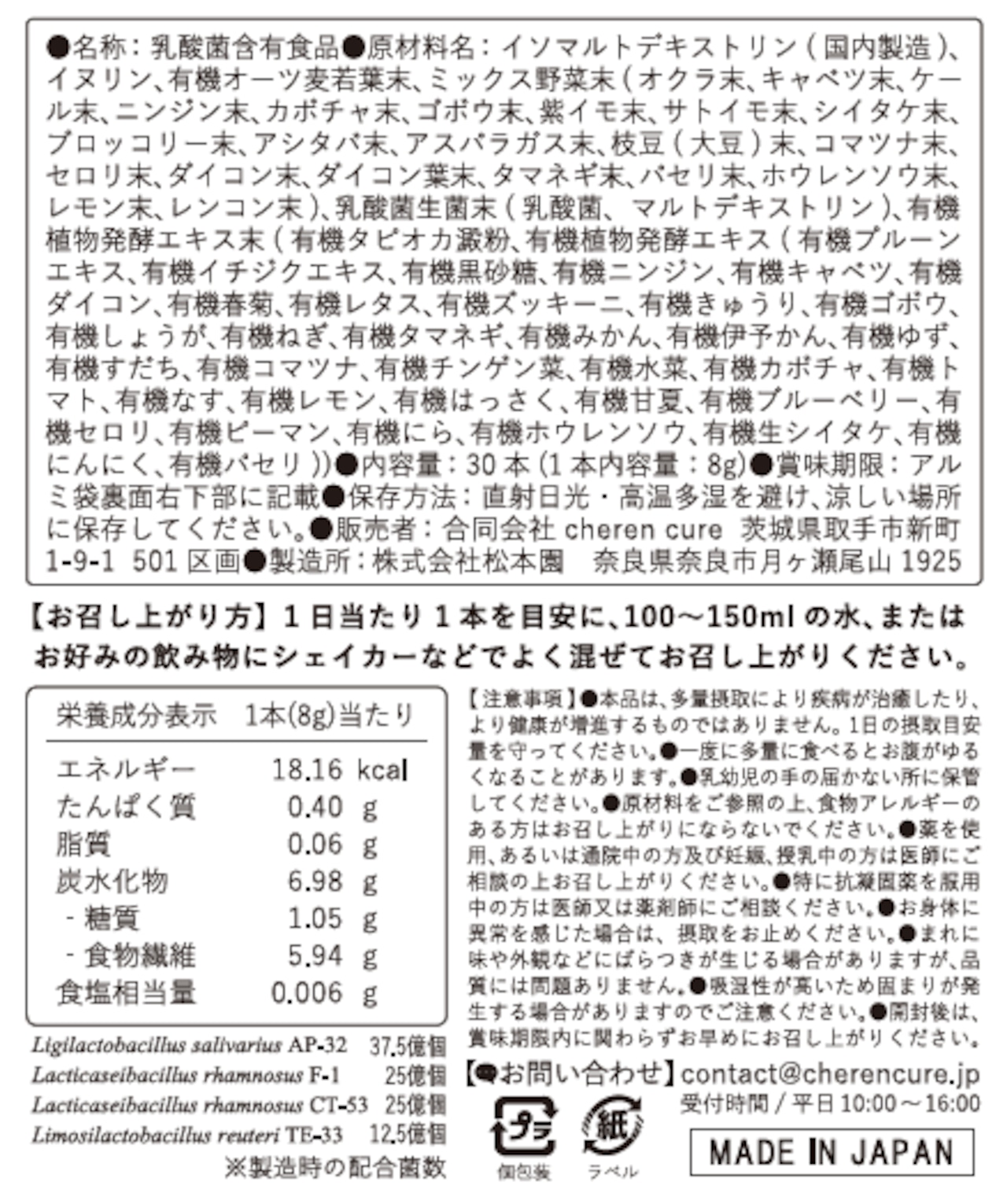 イソマルトデキストリン( 国内製造)、イヌリン、有機オーツ麦若葉末、ミックス野菜末( オクラ末、キャベツ末、ケール末、ニンジン末、カボチャ末、ゴボウ末、紫イモ末、サトイモ末、シイタケ末、ブロッコリー末、アシタバ末、アスパラガス末、枝豆( 大豆) 末、コマツナ末、セロリ末、ダイコン末、ダイコン葉末、タマネギ末、パセリ末、ホウレンソウ末、レモン末、レンコン末)、乳酸菌生菌末( 乳酸菌、マルトデキストリン)、有機植物発酵エキス末( 有機タピオカ澱粉、有機植物発酵エキス( 有機プルーンエキス、有機イチジクエキス、有機黒砂糖、有機ニンジン、有機キャベツ、有機ダイコン、有機春菊、有機レタス、有機ズッキーニ、有機きゅうり、有機ゴボウ、有機しょうが、有機ねぎ、有機タマネギ、有機みかん、有機伊予かん、有機ゆず、有機すだち、有機コマツナ、有機チンゲン菜、有機水菜、有機カボチャ、有機トマト、有機なす、有機レモン、有機はっさく、有機甘夏、有機ブルーベリー、有機セロリ、有機ピーマン、有機にら、有機ホウレンソウ、有機生シイタケ、有機にんにく、有機パセリ))